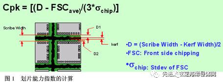 封裝工藝設計規(guī)則限定崩角不能進入芯片邊緣的密封圈。如果將崩角大小作為評核晶圓切割質量/能力的一個指標,則可用公式來計算晶圓切割能力指數(shù)(Cpk)(圖1)。