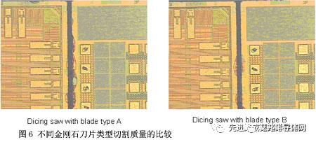 對于低k晶圓而言,金屬層/ILD層的分層或剝離以及崩角相比生產成本更重要(在生產成本允許范圍內)?;趯嶒?,優(yōu)選2-4um的金剛石顆粒、較低的金剛石密度和較軟的粘結材料的劃片刀作為進一步優(yōu)化劃片制程的基礎。圖6是不同類型的劃片刀切割質量的比較。劃片刀A具有較大的金剛石顆粒,較硬的粘結材料,而劃片刀B具有較小的金剛石顆粒,較軟的粘結材料(表),很明顯,劃片刀B的切割質量優(yōu)于劃片刀A?!?/span>