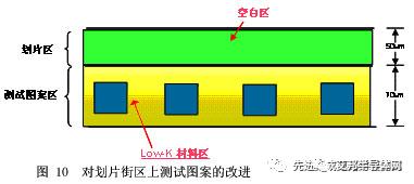 另外,在有限的街區(qū)寬度內(比如120um),如果能將測試圖案限制在70um之內,并將其偏置于街區(qū)的一側,那么,在街區(qū)的另一側,就形成了一個寬為50um的“空白”區(qū)域。如果將這個50um寬的區(qū)域作為假想街區(qū),則低k晶圓的劃片就演變?yōu)橐粋€窄街區(qū)(50um)非低k晶圓的劃片問題(圖10)。以目前劃片機和劃片工藝能力來說,這種切割方式是可行的。