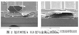 圖1 D1、D2代表劃片街區(qū)中保留完整的部分,FSC是指正面崩角的大小。依照封裝工藝設計規(guī)則,D1、D2的最小值可以為0,允許崩角存在的區(qū)域寬度D為(街區(qū)寬度-刀痕寬度)/2, 為D1、D2的平均值, 為D1、D2的方差。依統(tǒng)計學原理,對于一個合格的劃片工藝而言,其切割能力指數(shù)應大于1.5?!》謱优c剝離(Delamination & Peeling) 由于低k ILD層獨特的材料特性,低k晶圓切割的失效模式除了崩角缺陷外,芯片邊緣的金屬層與ILD層的分層和剝離是另一個主要缺陷(圖2)。