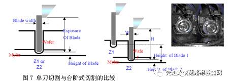 臺階式切割使用兩個劃片刀,第一劃片刀較厚,依程序切入晶圓內某一深度,第二劃片刀較薄,它沿第一劃片刀切割的中心位置切透整個晶圓并深入承載薄膜的1/3厚度。臺階式切割的優(yōu)點在于:減小了劃片刀在切割過程中對晶圓施加的壓力;減少了必須使用較高的刀高/刀寬比的劃片刀所帶來的機械擺動和嚴重的崩角問題;提供了選擇不同類型的劃片刀的可能性來分別優(yōu)化正面崩角/分層及背面崩角。