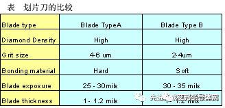 對于低k晶圓而言,金屬層/ILD層的分層或剝離以及崩角相比生產成本更重要(在生產成本允許范圍內)?;趯嶒?,優(yōu)選2-4um的金剛石顆粒、較低的金剛石密度和較軟的粘結材料的劃片刀作為進一步優(yōu)化劃片制程的基礎。圖6是不同類型的劃片刀切割質量的比較。劃片刀A具有較大的金剛石顆粒,較硬的粘結材料,而劃片刀B具有較小的金剛石顆粒,較軟的粘結材料(表),很明顯,劃片刀B的切割質量優(yōu)于劃片刀A?!?/span>