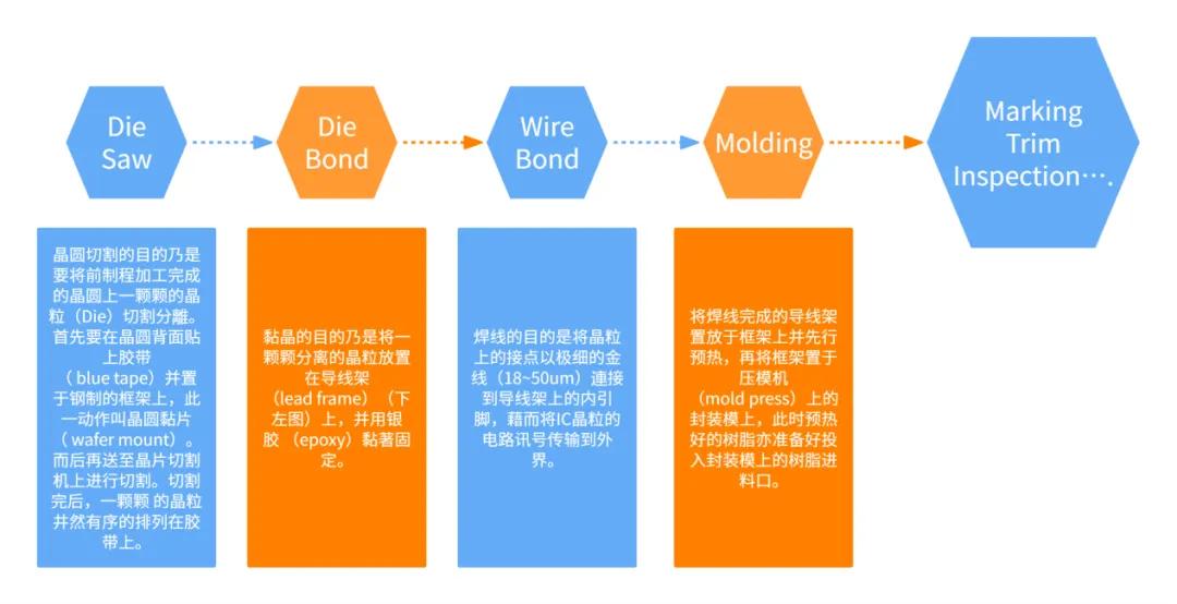 以上是一個(gè)簡(jiǎn)化的流程,實(shí)際的半導(dǎo)體封測(cè)流程可能會(huì)因產(chǎn)品類型、封裝類型以及制造商的工藝差異而有所不同,同時(shí)也衍生了大量的專業(yè)術(shù)語。接下來,本文將針對(duì)其中三個(gè)關(guān)鍵的制程進(jìn)行介紹。