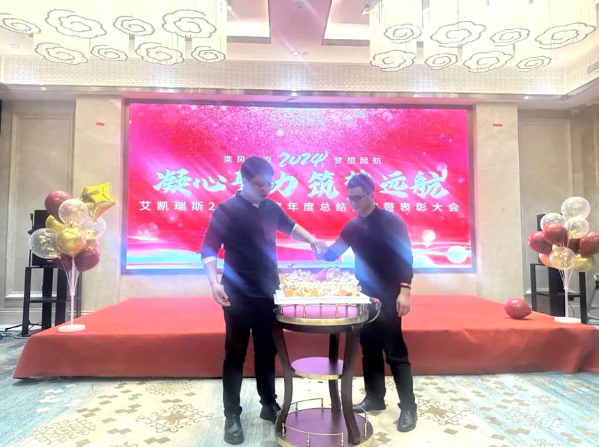 在年會(huì)的高潮時(shí)刻,胡總和龔總攜手走到了舞臺(tái)中央,為在場(chǎng)的大家切開(kāi)蛋糕?!耙宦废喟椋兄x有您”,蛋糕上的文字代表著艾凱瑞斯從2019到2024五年共度的風(fēng)風(fēng)雨雨。正是因?yàn)橛辛斯久恳粋€(gè)人的不懈努力和奉獻(xiàn),艾凱瑞斯才能不斷成長(zhǎng)和進(jìn)步。